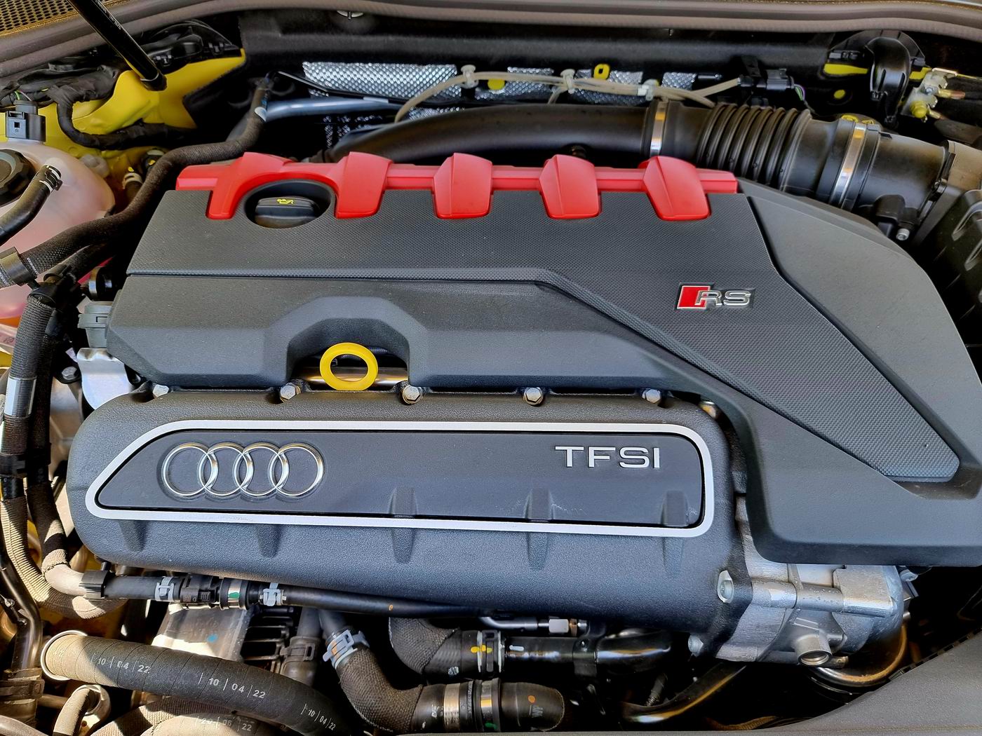 The Audi RS 3 is powered by the legendary 2.5 TFSI engine from Audi Sport with 294 kW (400 PS) and maximum torque of 500 Newton meters. This means the RS 3 (Combined fuel consumption in l/100 km: 9.5–9.1 (24.8– 25.8 US mpg); combined CO2 emissions in g/km: 217–207 (349.2–333.1 g/mi); CO2-class: G) accelerates from 0 to 100 km/h in 3.8 seconds and can reach a top speed of 290 km/h. Numerous motorsport successes make the award-winning five-cylinder engine one of the most evocative at Audi and make driving the RS 3 an incomparable experience. In particular this is due to its unique sound, which is based on the signature 1-2-4-5-3 firing sequence.