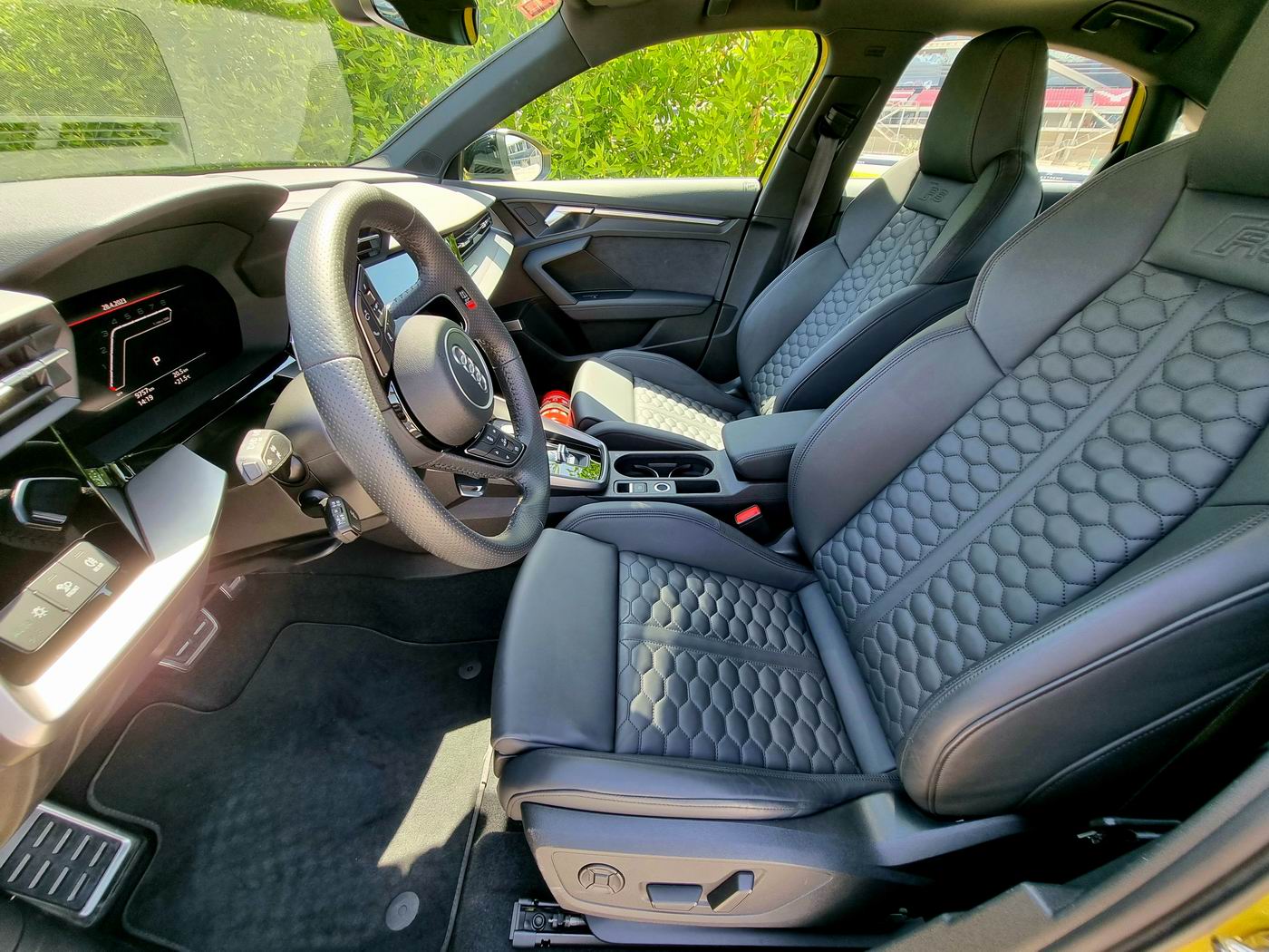 Audi Sport gives the RS 3 many ingredients for full enjoyment, such as the five-cylinder turbo engine, torque splitter, standard tires, and semi-slicks. As all good chefs know, we eat with our eyes first. The RS 3 has been garnished with wheels in motorsport design, carbon and black packages, RS bucket seats, and a steering wheel flattened at the top and bottom. The RS 3 is a recipe for success.