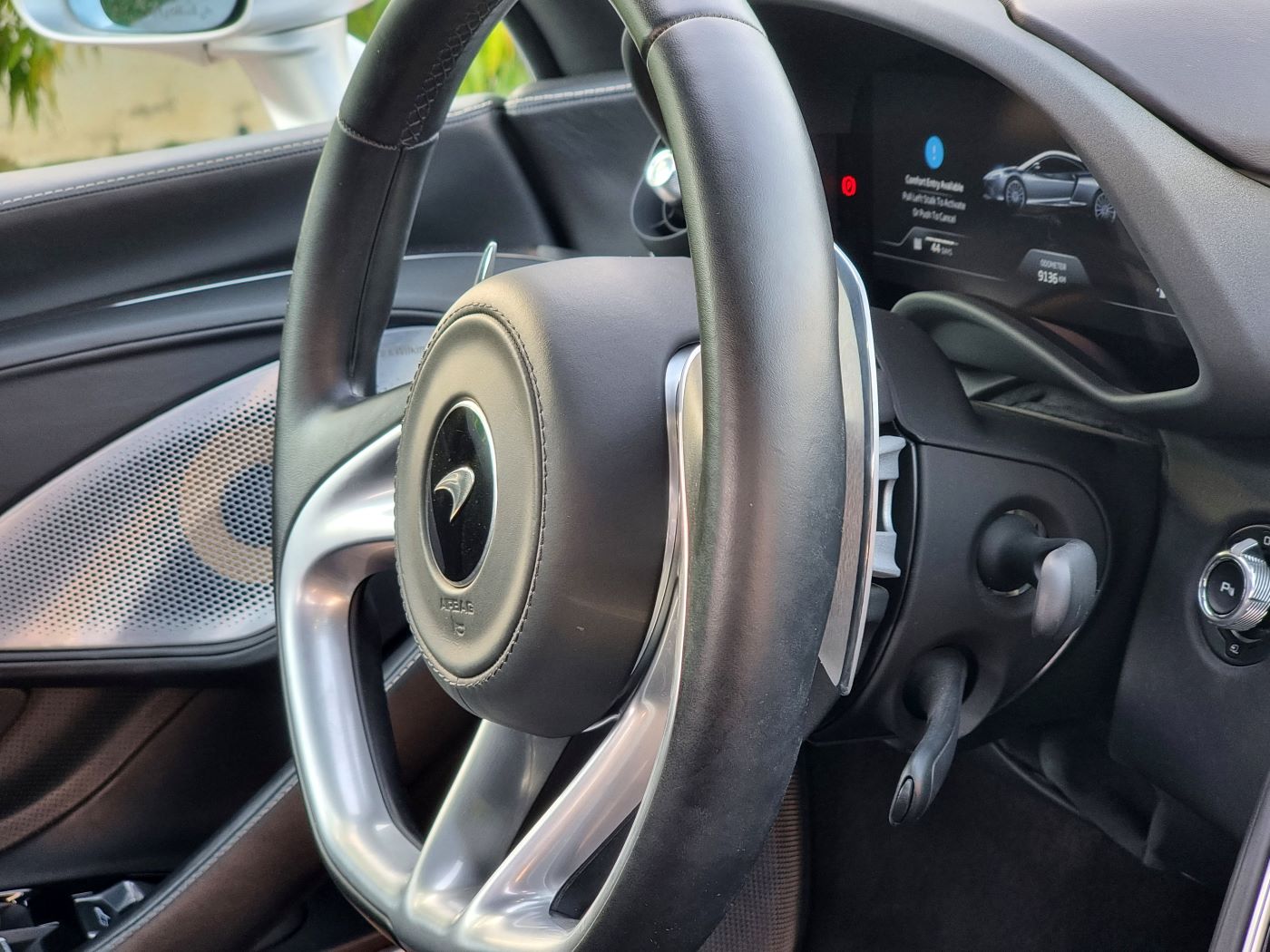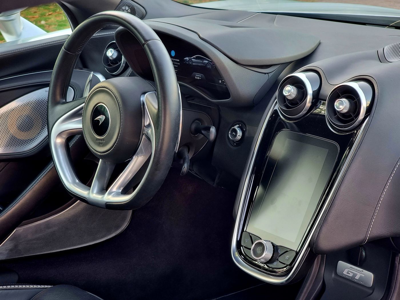 Inside, the GT offers a refined, luxurious environment. The cabin is trimmed in premium materials such as soft-grain leather, machined aluminium, and optional cashmere, a first for a production car. The design is modern and driver-focused, with a clean layout, subtle ambient lighting, and a digital instrument cluster. Comfort is enhanced by options like an electrochromic glass roof that can tint electronically, helping manage light and heat without compromising the sleek roofline. While McLaren has never been known for overloading their cars with technology, the infotainment system in the GT is intuitive and functional, with controls that are simple and responsive, although not as advanced as some luxury competitors.