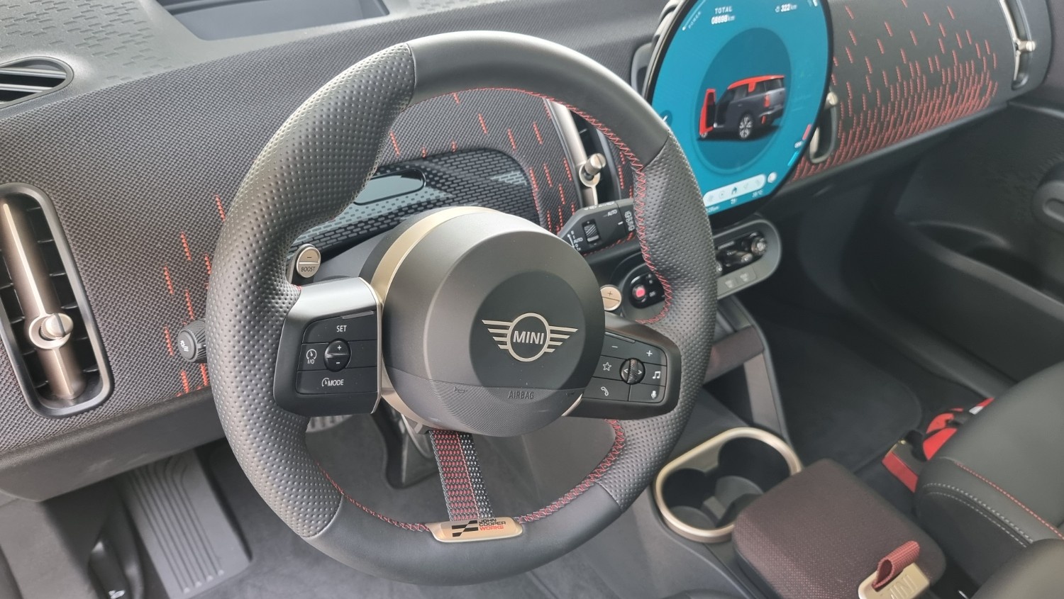 Inside the cabin, the 2026 Countryman JCW introduces a modern interior layout that combines Mini’s distinctive design philosophy with contemporary digital technology. The dashboard features a large circular central display that acts as the main interface for the infotainment system.