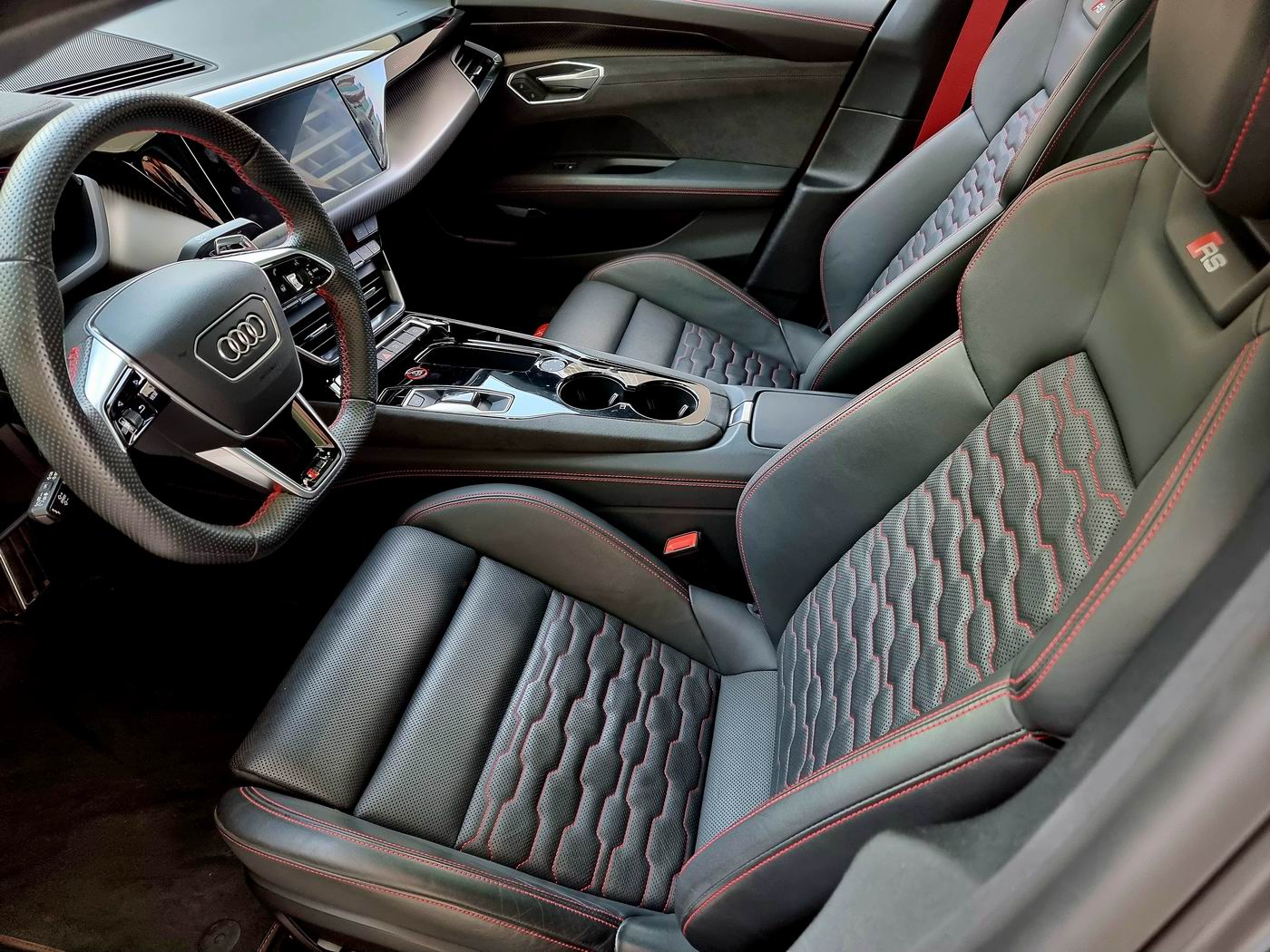 The RS e-tron GT is not just about raw power, it’s engineered for precision and control. It features adaptive three-chamber air suspension, which continuously adjusts ride height and damping based on road conditions and drive mode. Rear-wheel steering improves low-speed agility and high-speed stability, while Audi Drive Select allows the driver to choose from several modes (Comfort, Efficiency, Dynamic, and Individual) that fine-tune throttle response, suspension stiffness, and steering weight. Regenerative braking is adjustable and works in tandem with the mechanical brakes to recover energy while maintaining smooth deceleration. In higher trims, carbon-ceramic brakes are available for even greater stopping power.