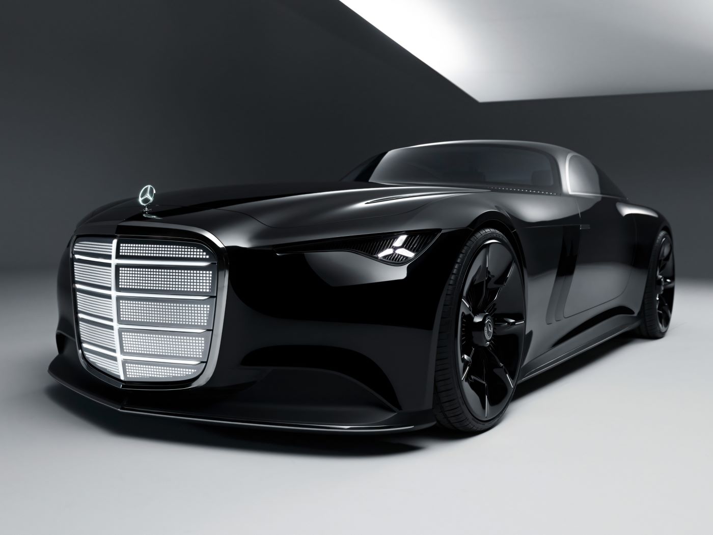 Vision Iconic perfectly demonstrates the brand’s elevated design language by refining the iconic grille - bold, upright and proud - to a digital status front and by integrating the brightly illuminated star on the bonnet. The illumination of the iconic star and the chrome grille in combination with animation scenarios for the grille demonstrate the importance of light integration for the emotionalisation of digital design. The distinctive front design is enriched through slim, modern and self-confident headlights infused with the latest lighting technology. The deep black high-gloss paint finish emphasises the sculptural exterior design of the show car.