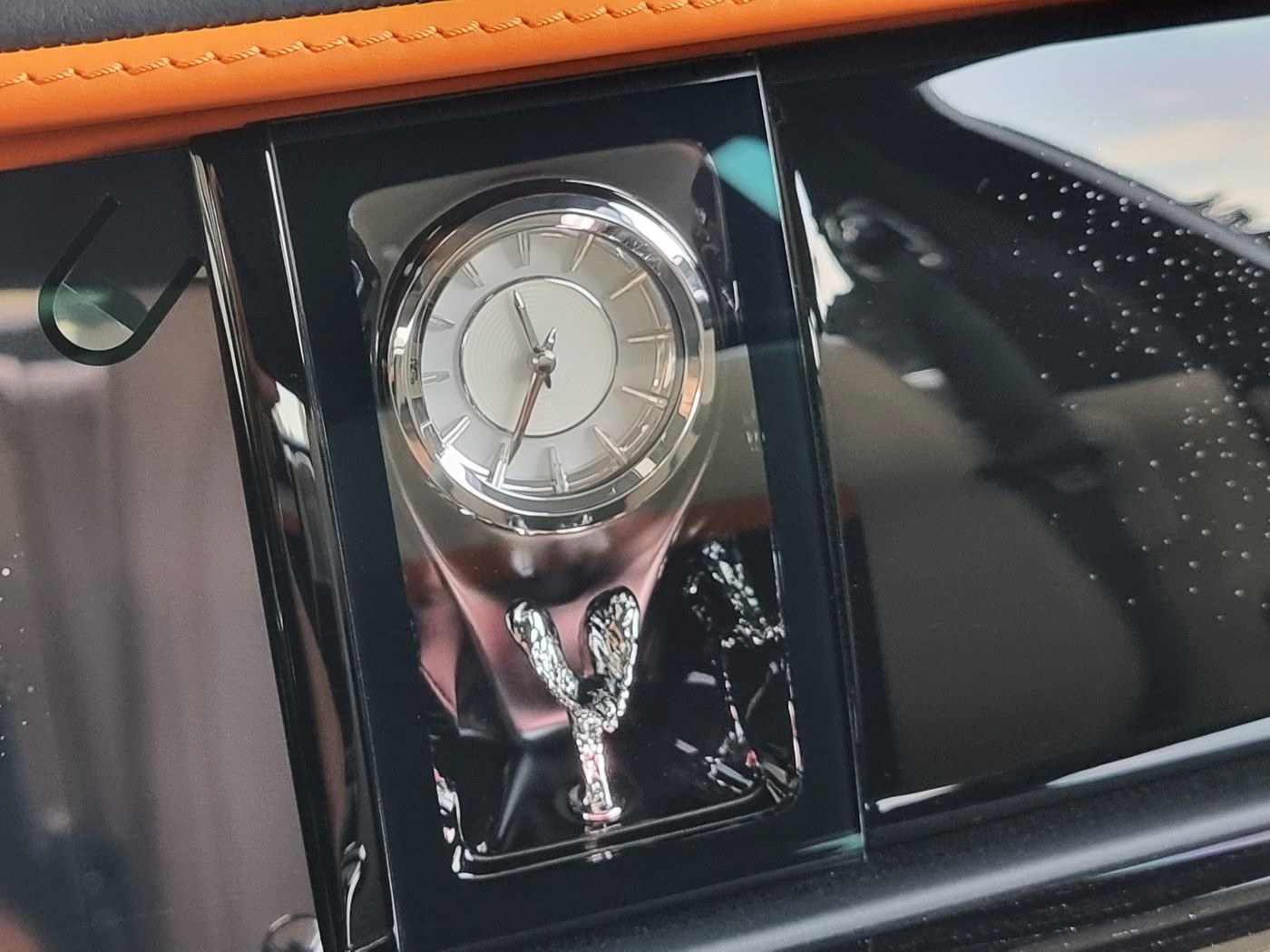 Ghost Series II benefits from bold new expressions of contemporary craft, meticulously conceived by the marque’s artisans. Alongside the Central Information Display, on the passenger side, is the new Spirit of Ecstasy Clock Cabinet. This vitrine houses an analogue timepiece and an up-lit, mirror-polished, solid stainless-steel Spirit of Ecstasy figurine. She is placed on a stage with a matte black back panel and high gloss side panels to create a reflection effect. On entering the motor car, the Spirit of Ecstasy is initially illuminated from below, as if she is being lit by a spotlight, before her stage lighting settles to a soft glow.